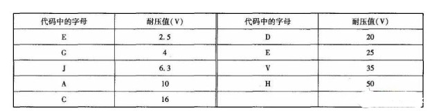 ③使用代码法,通常由一个字母和三个数字组成,字母表示电解电容的耐压值,数字用来标明电容量,单位为pF。前两位数字表示电容量的有效数字,第三位数字表示有效数字乘以10的幂次。贴片电解电容上面的指示条标明此端为电解电容的正极。贴片电解电容代码中的字母与耐压值的关系见下表。
